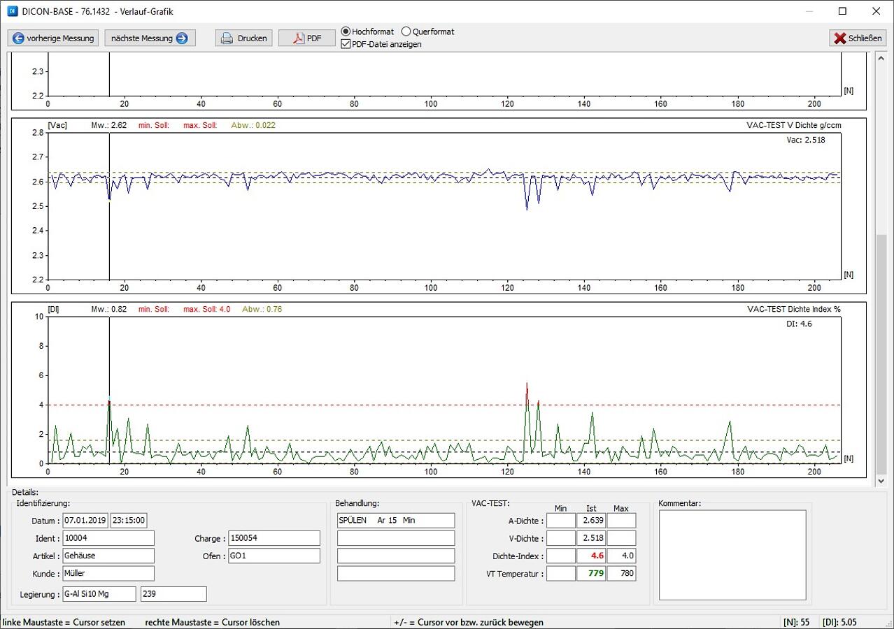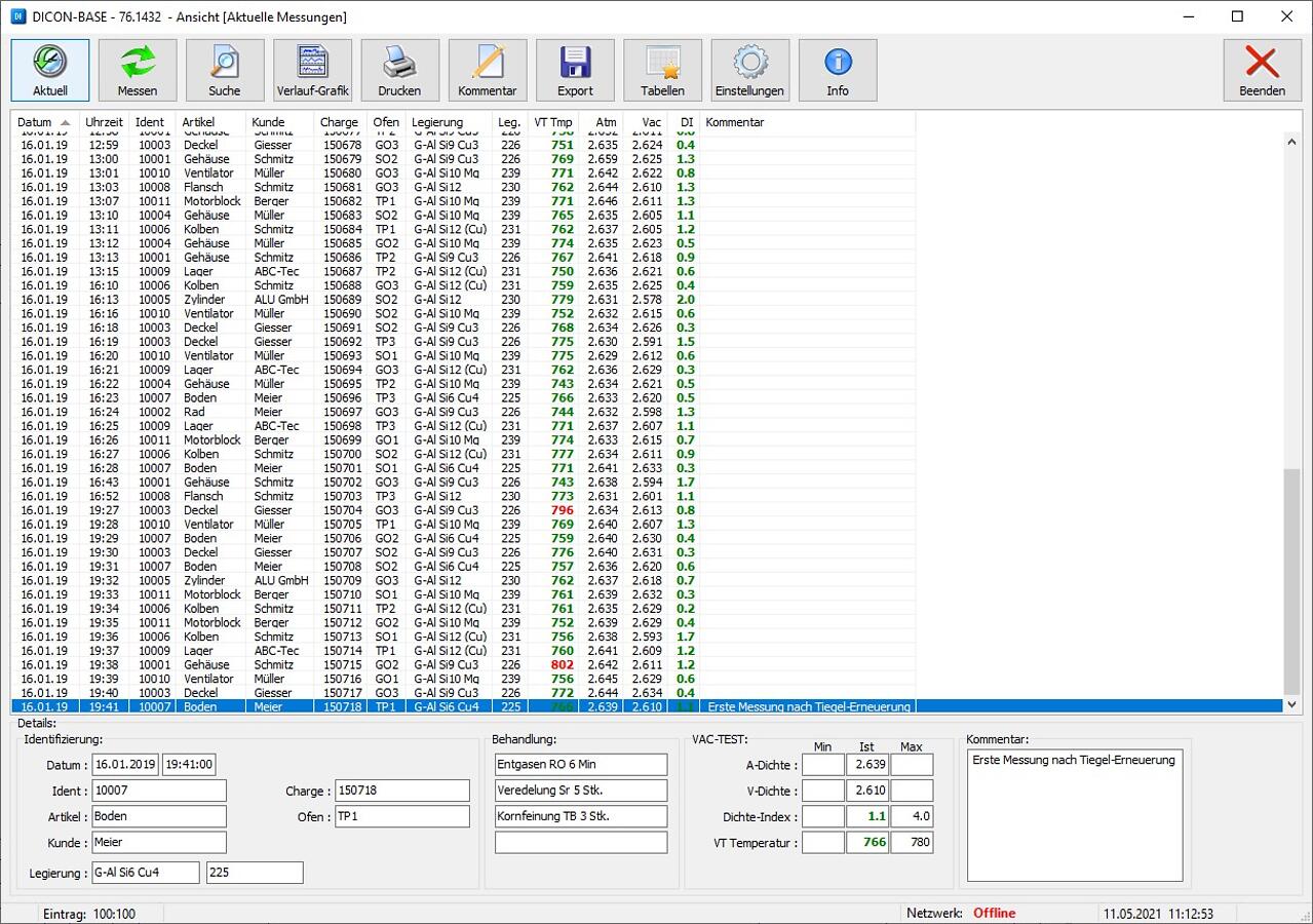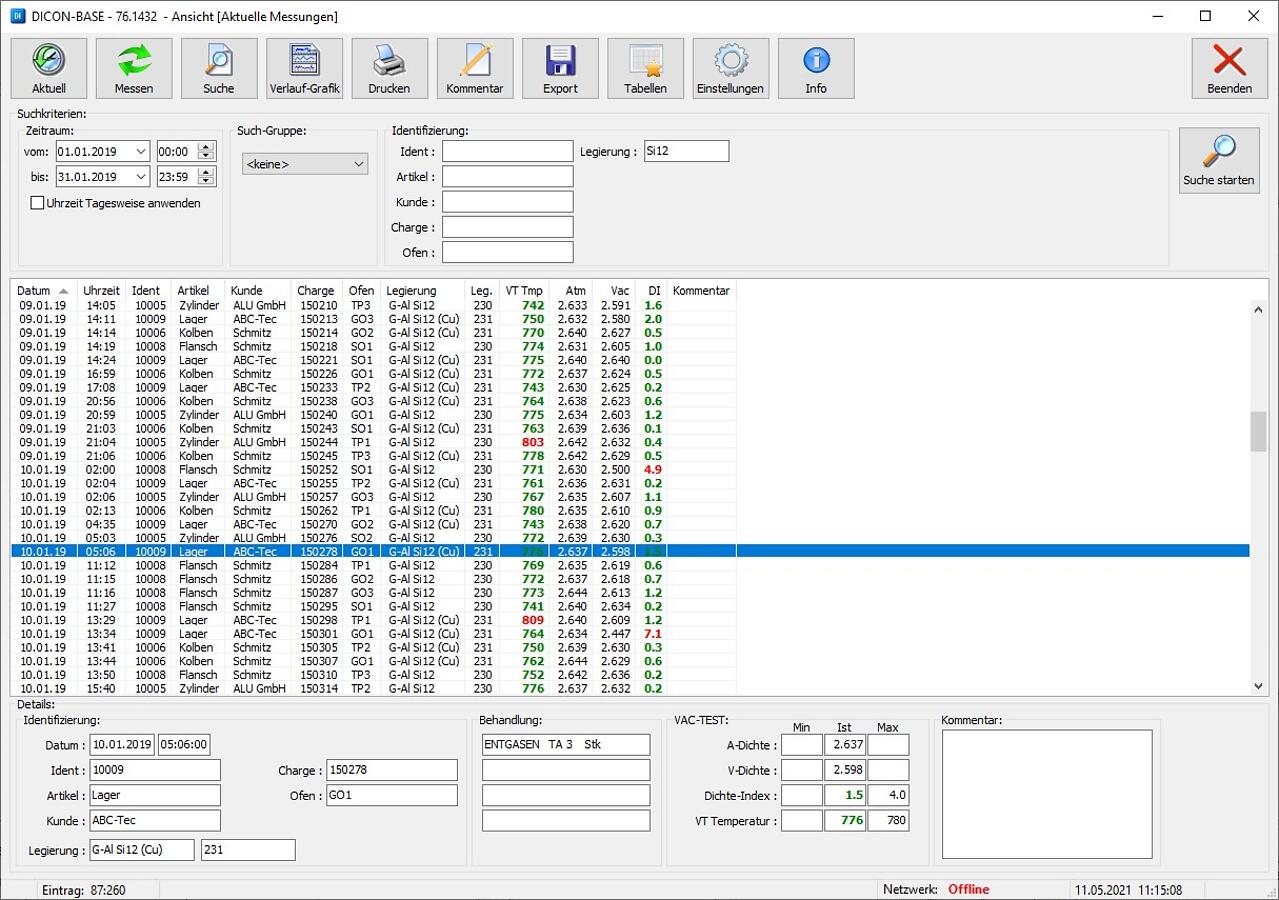 Software zum automatischen Einlesen und Verwalten von VAC-TEST-Daten mit anwenderbezogener Proben-Identifizierung sowie tabellarischer und grafischer Auswertung der Daten zur Findung von Abhängigkeiten und Klärung von Einflüssen.