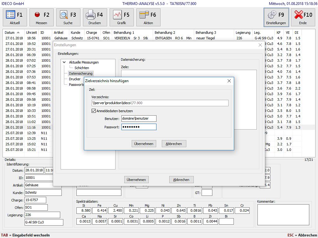Anwenderbezogene Identifizierung jeder Messung (z.B. „Artikel“, „Kunde“, „Charge“, „Ofen“, „Legierung“, usw.) mit Plausibilitätsprüfung