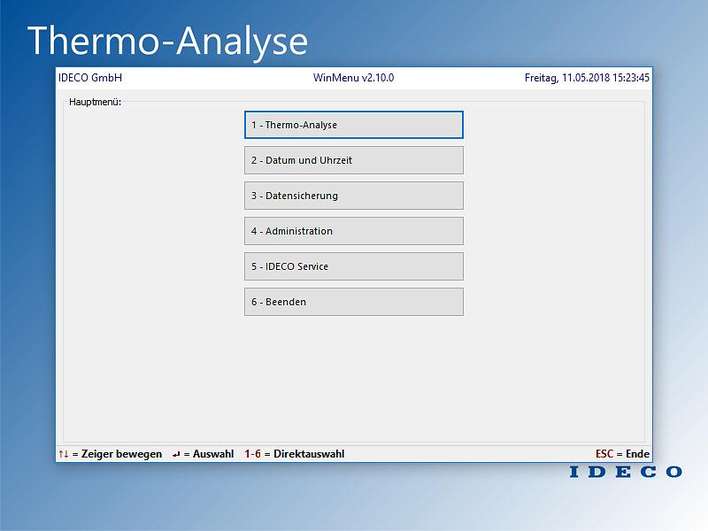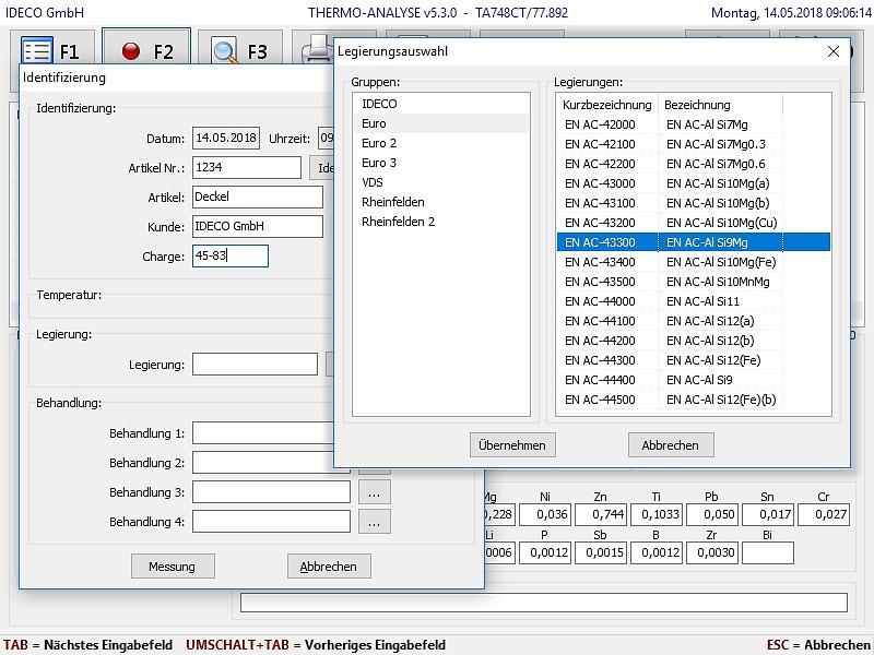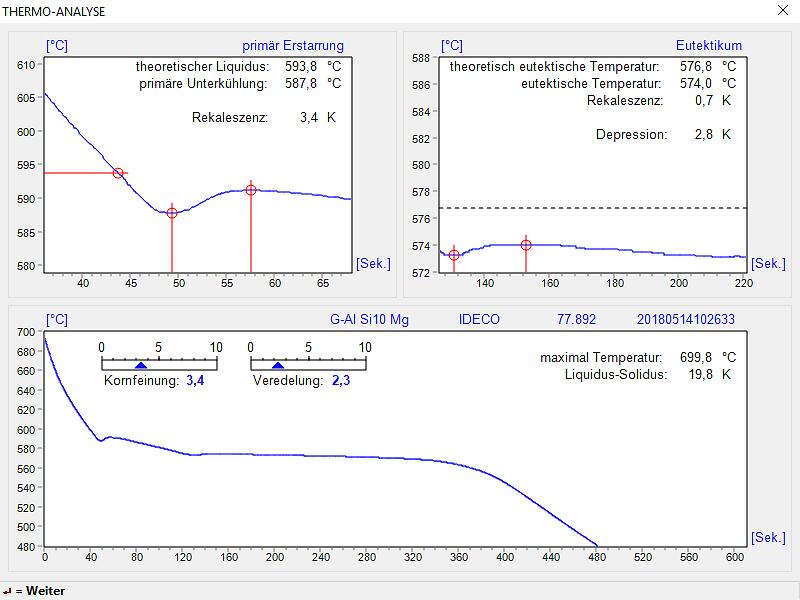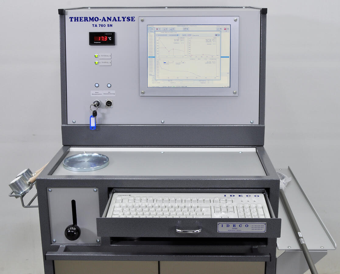 Die Thermische Analyse der IDECO® kurz Thermo Analyse genannt, ist ein qualitatives Mess-System zur einfachen Bestimmung von Kornfeinung und Veredelung von flüssigen Aluminium-Legierungen. Dazu wird die Abkühlverlauf einer Metallprobe detailliert aufgezeichnet und automatisch analysiert. Die Temperaturaufzeichnung und das Messergebnis werden grafisch angezeigt.