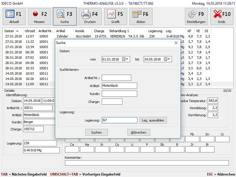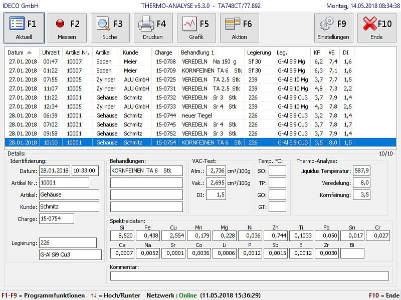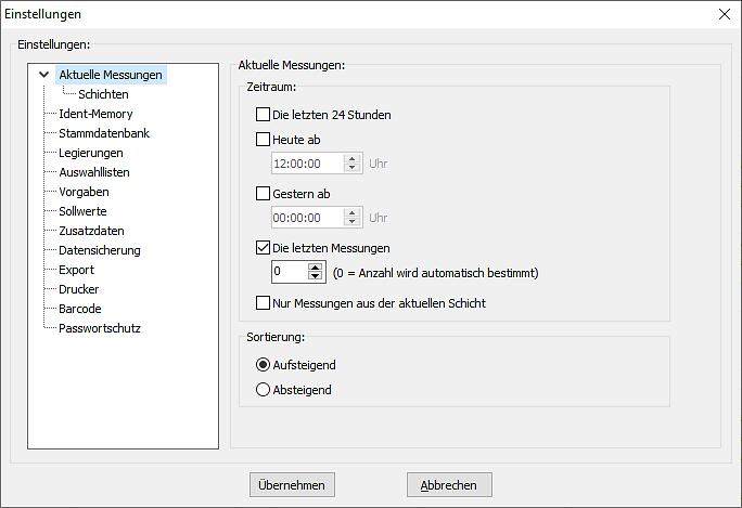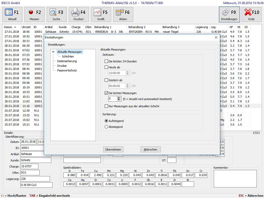 Anwenderbezogene Identifizierung jeder Messung (z.B. „Artikel“, „Kunde“, „Charge“, „Ofen“, „Legierung“, usw.) mit Plausibilitätsprüfung