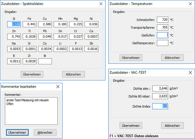 Thermo-Analyse-Messungen können nachträglich um Zusatzdaten (z.B. VAC-TEST / Spektral / Temperaturen) und einen Kommentar ergänzt werden